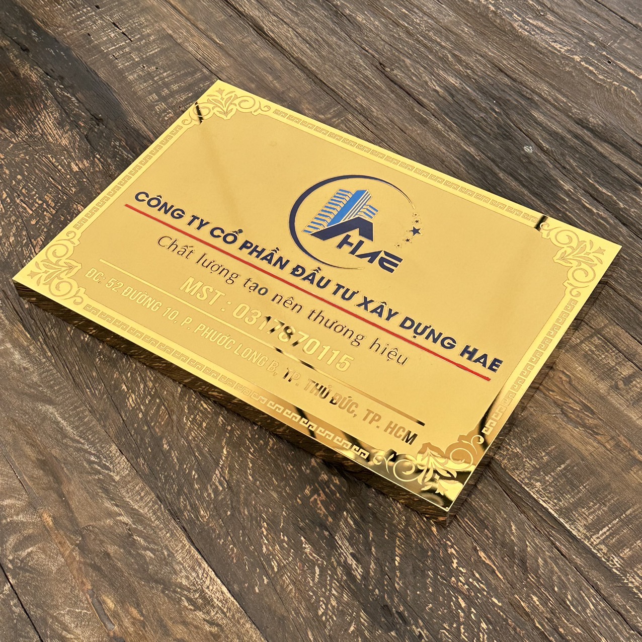 * Sản phẩm: Bảng công ty. Inox Inox 304 vàng gương, Dựng chân nổi, họa tiết ăn mòn. Ngoài trời, cao cấp