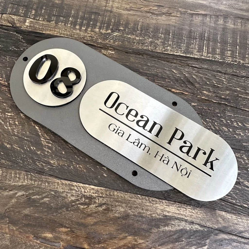 Biển Số Nhà Nền Alcorest + Mica cán ghi sần, Inox 304 xước bạc, số nhà nổi + in UV, ngoài trời. BSN-QC24H019