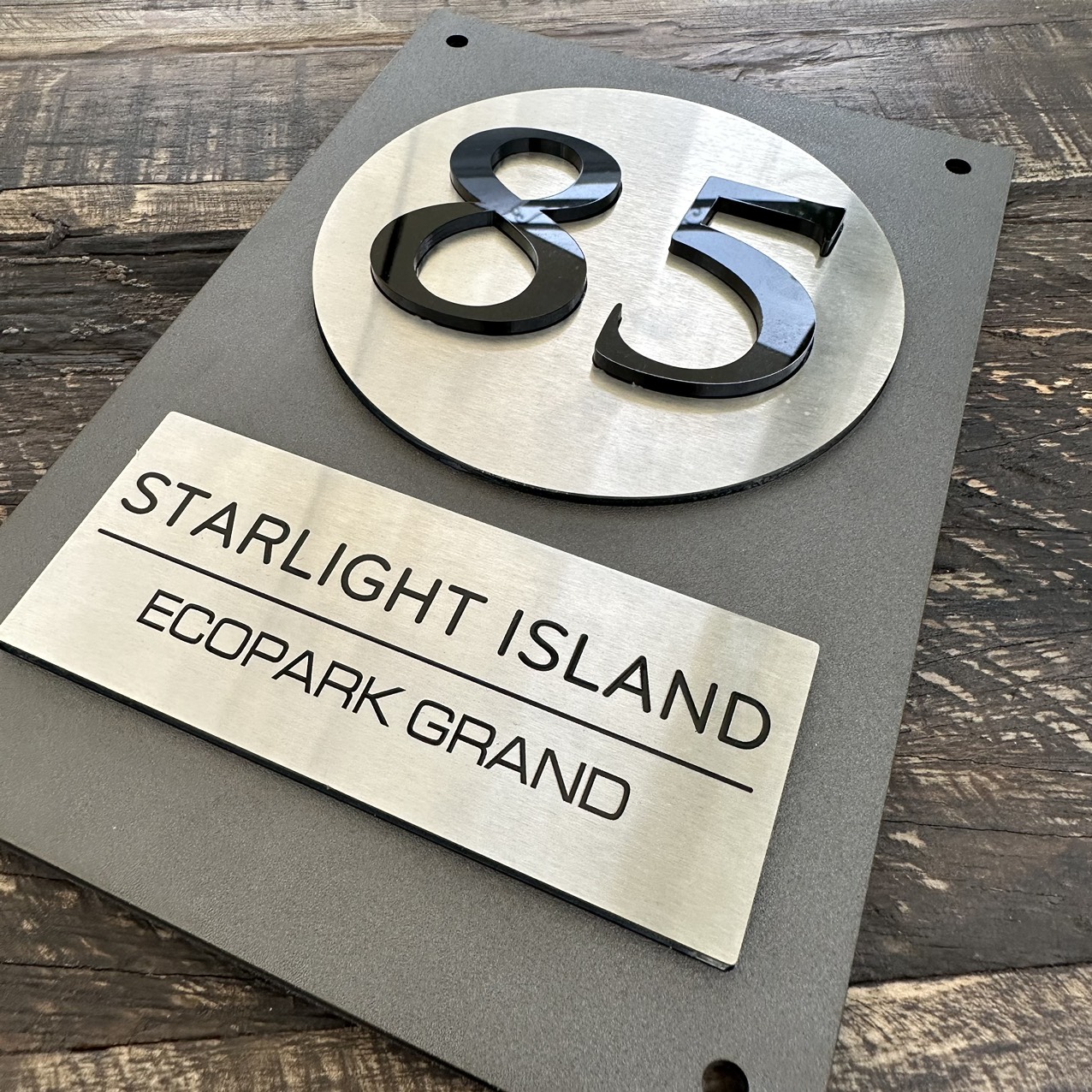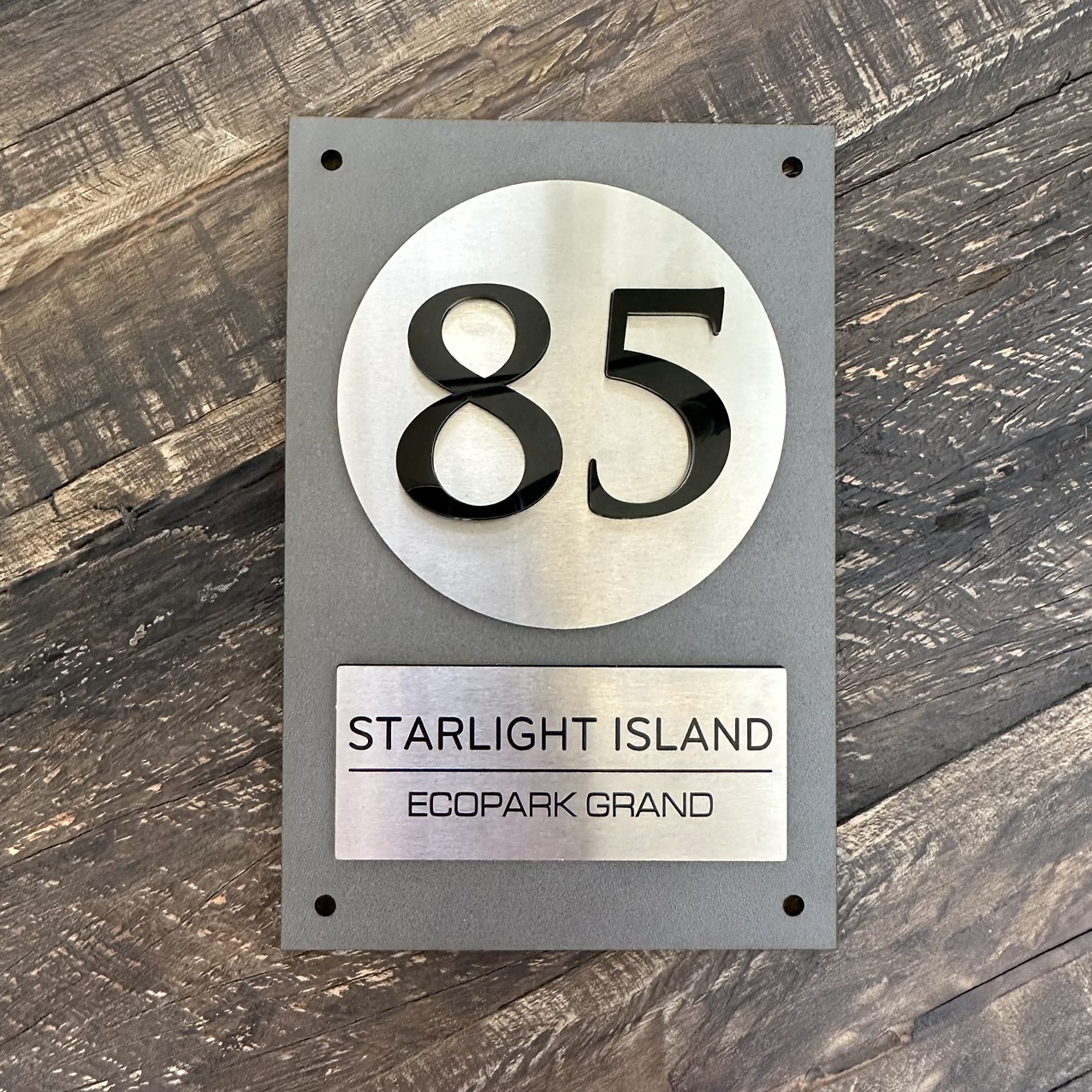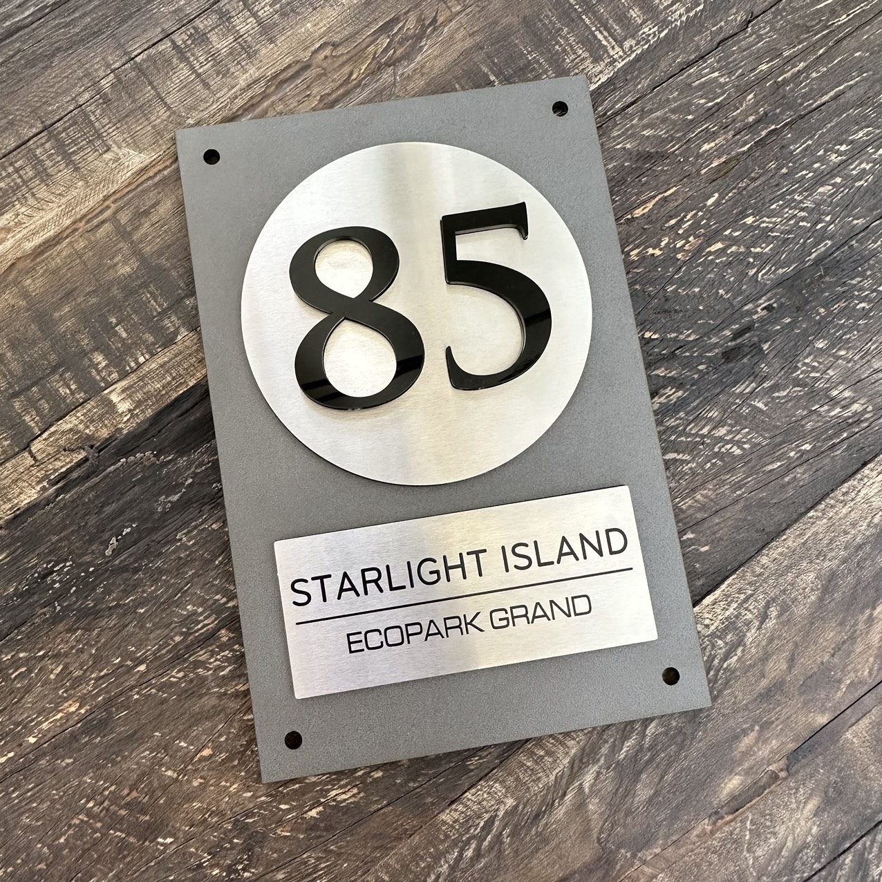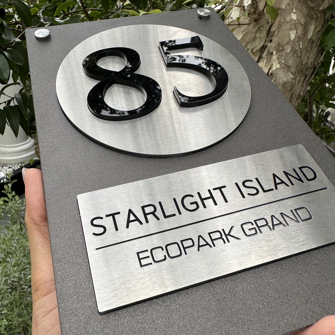 Biển Số Nhà Nền Alcorest + Mica cán ghi sần, Inox 304 xước bạc, số nhà nổi + in UV, ngoài trời. BSN-QC24H020